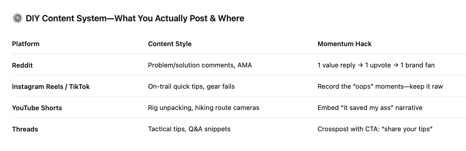 Authentic use-case content, UGC, gear fails, mini how‑tos-posted daily, reactively, not polished.